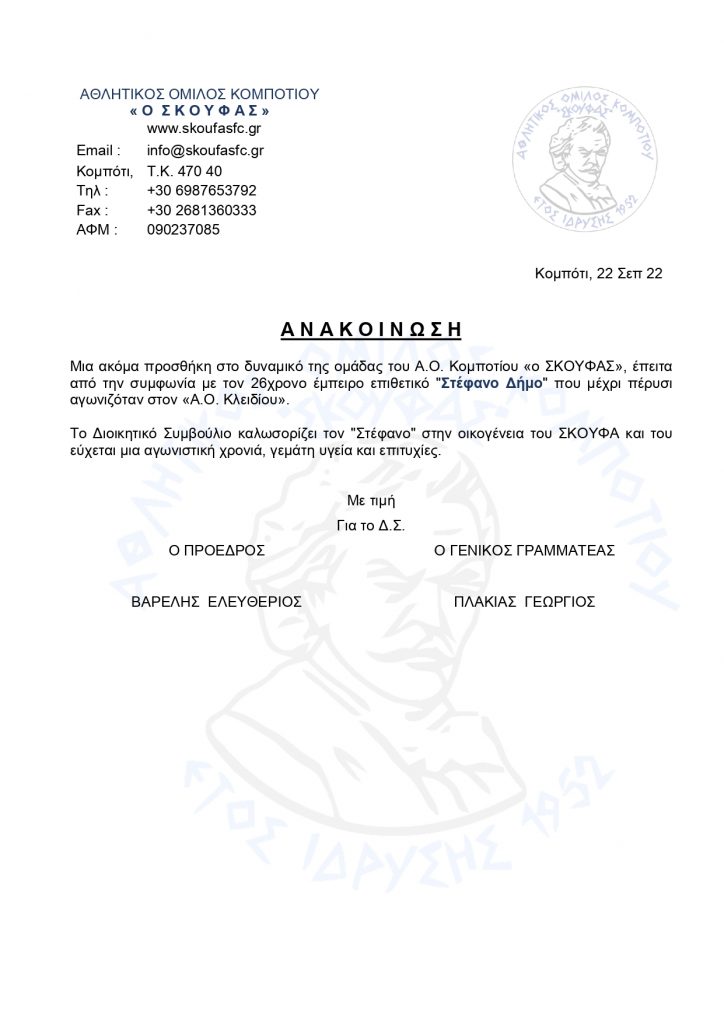 Επιστροφή Παναγιώτη Δήμου στον Σκουφά